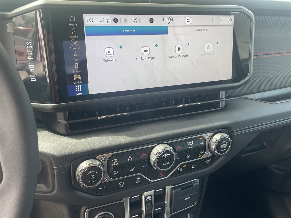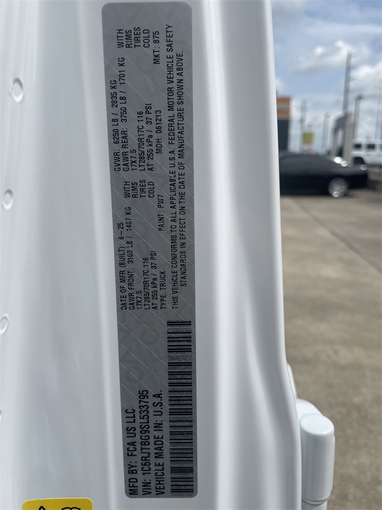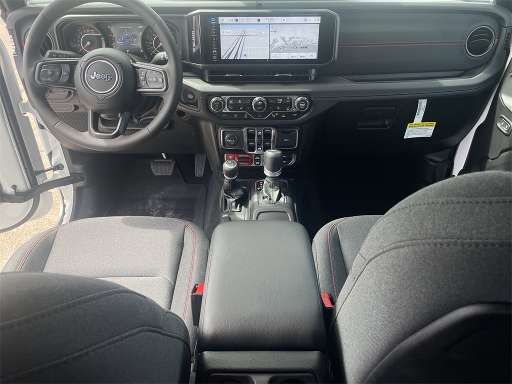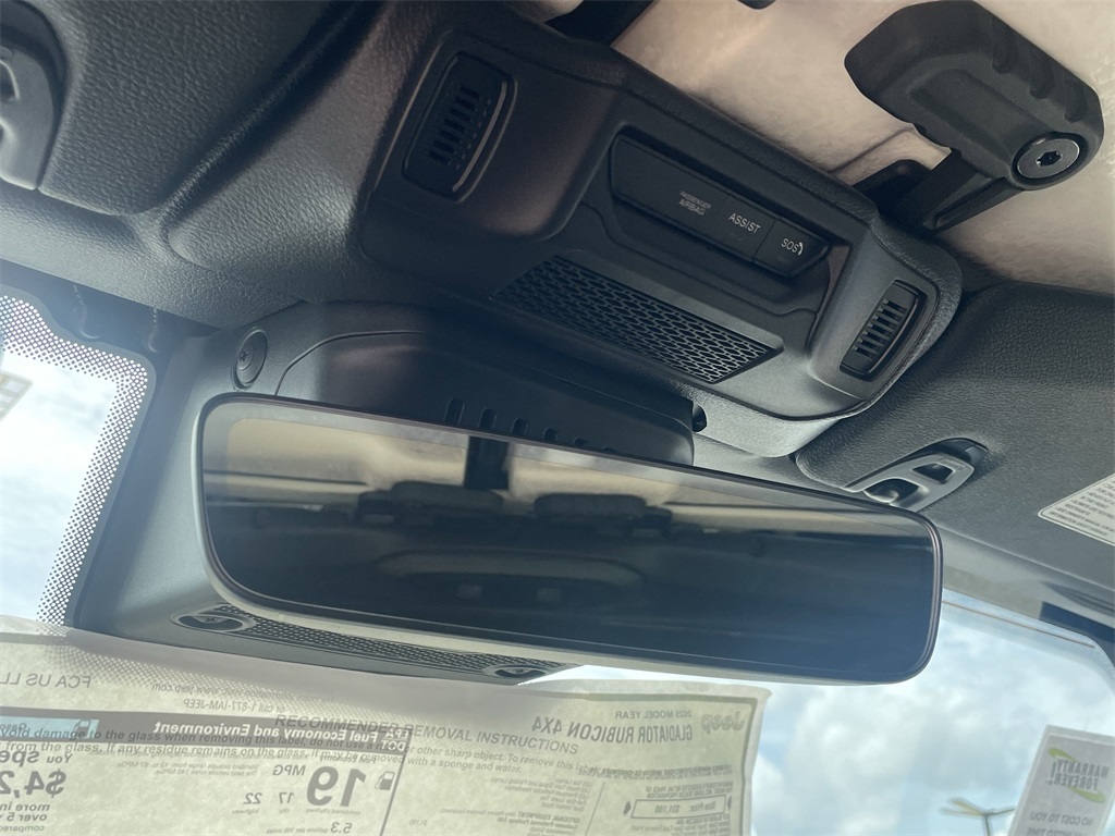 ss Path Detection, and ParkSense Rear Park Assist System), Technology Group (12.3" Touchscreen Display, 4G LTE Wi-Fi Hot Spot, Alexa Built-In, Apple CarPlay, Auto-Dimming Rear-View Mirror, Bluetooth Wireless Speaker, Connected Travel & Traffic Services, Connectivity - US/Canada, Google Android Auto, GPS Antenna Input, GPS Navigation, HD Radio, Integrated Off-Road Camera, Integrated Voice Command w/Bluetooth, Radio: Uconnect 5 Nav w/12.3" Display, and USB Host Flip), 4-Wheel Disc Brakes, 4.10 Rear Axle Ratio, 8 Speakers, 97 MPH Vehicle Max Speed Calibration, ABS brakes, Air Conditioning, Alloy wheels, Alpine Premium Audio System, AM/FM radio: SiriusXM, Apple CarPlay/Android Auto, Automatic temperature control, Black 3-Piece Hard Top, Brake assist, Cloth Low-Back Bucket Seats, Compass, Delay-off headlights, Driver door bin, Driver vanity mirror, Dual front impact airbags, Dual front side impact airbags, Electronic Stability Control, Emergency communication system: Jeep Connect, Freedom Panel Storage Bag, Front anti-roll bar, Front Bucket Seats, Front Center Armrest w/Storage, Front dual zone A/C, Front fog lights, Front License Plate Bracket, Front reading lights, Fully automatic headlights, Heated door mirrors, Illuminated entry, Integrated roll-over protection, Low tire pressure warning, MOPAR All-Weather Slush Mats, MOPAR Spray In Bedliner, Occupant sensing airbag, Outside temperature display, Overhead airbag, Panic alarm, Passenger door bin, Passenger vanity mirror, Performance Suspension, Power door mirrors, Power steering, Power windows, Radio data system, Radio: Uconnect 5 w/12.3" Display, Rear anti-roll bar, Rear reading lights, Rear Sliding Window, Rear Window Defroster, Remote keyless entry, Security system, Speed control, Split folding rear seat, Steering wheel mounted audio controls, Tachometer, Telescoping steering wheel, Tilt steering wheel, Traction control, Trip computer, Variably intermittent wipers, Voltmeter, and Wheels: 17" x 7.5" Machined/Painted Black. 2025 Jeep Gladiator Rubicon 4D Crew Cab Bright White Clearcoat 17/22 City/Highway MPG Price includes: $500 - 2025 National 2025 Military Bonus Cash. Exp. 01/04/2027