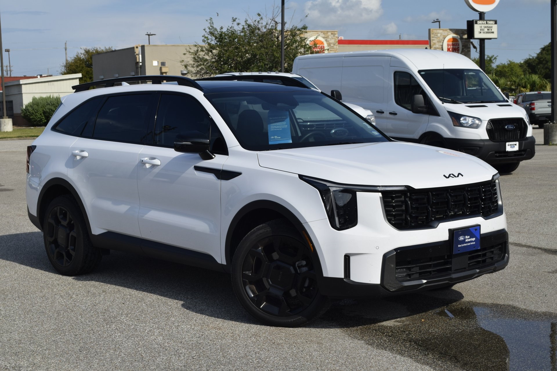Certified. Glacial White Pearl 2025 Kia Sorento X-Line EX AWD 8 Speed Dual Clutch 2.5L I4 DGI Turbocharged DOHC 16V LEV3-SULEV30 281hp Navigation System, Power Liftgate, Power moonroof.